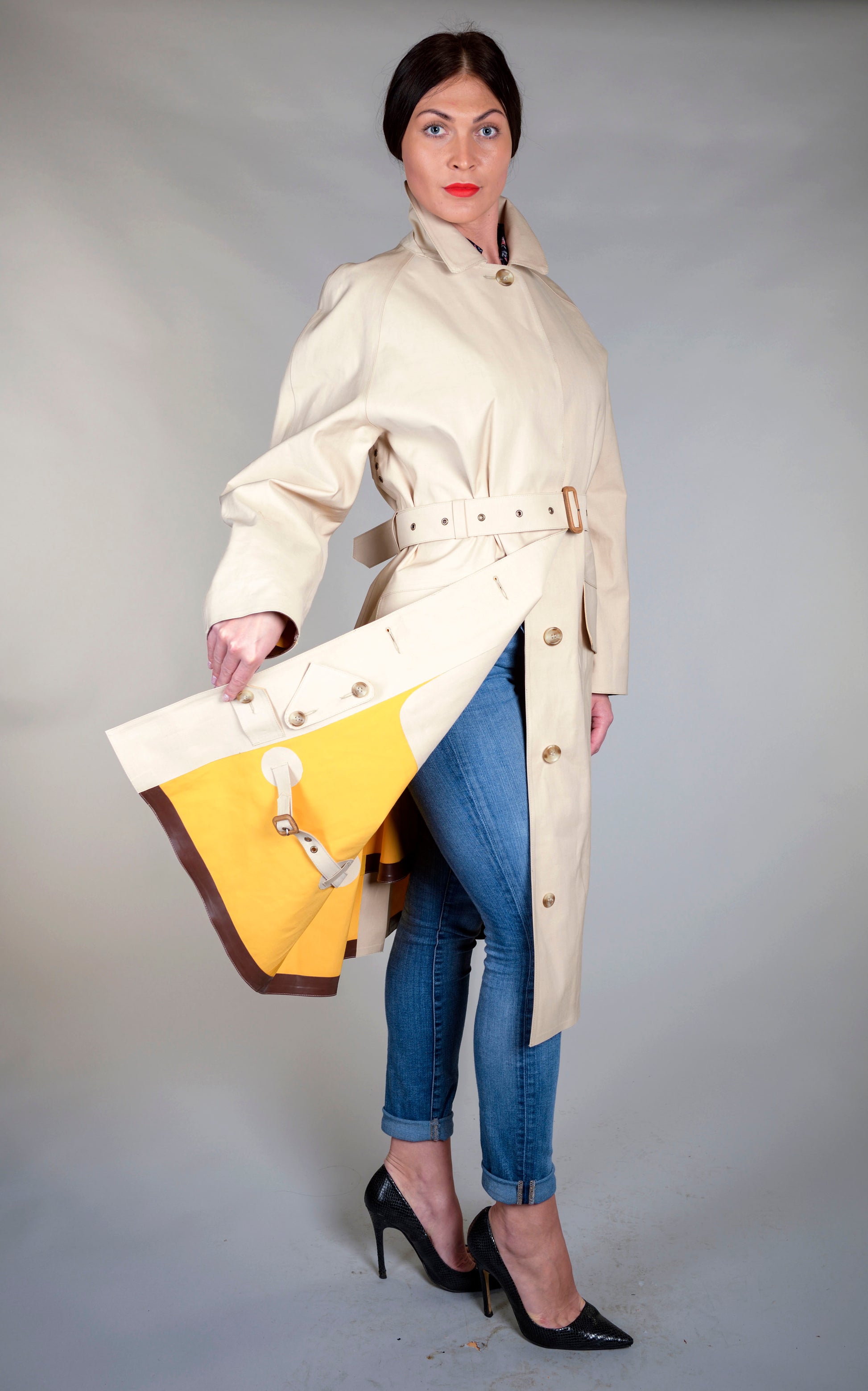 TOWN AND COUNTRY RIDING MAC. SINGLE BREASTED, FLY FRONT, RAGLAN SLEEVES WITH TABS, REAR VENT WITH SADDLE FLAP, LEG STRAPS, WIND CUFFS, SLANTED FLAP POCKETS, THROAT TAB, FRONT SKIRT TAB, BELTED. ALL SEAMS SOLUTIONED AND TAPED. MADE FROM PUTTY/YELLOW HEAVY DUTY DOUBLE TEXTURE COTTON. FULLY WATERPROOF.