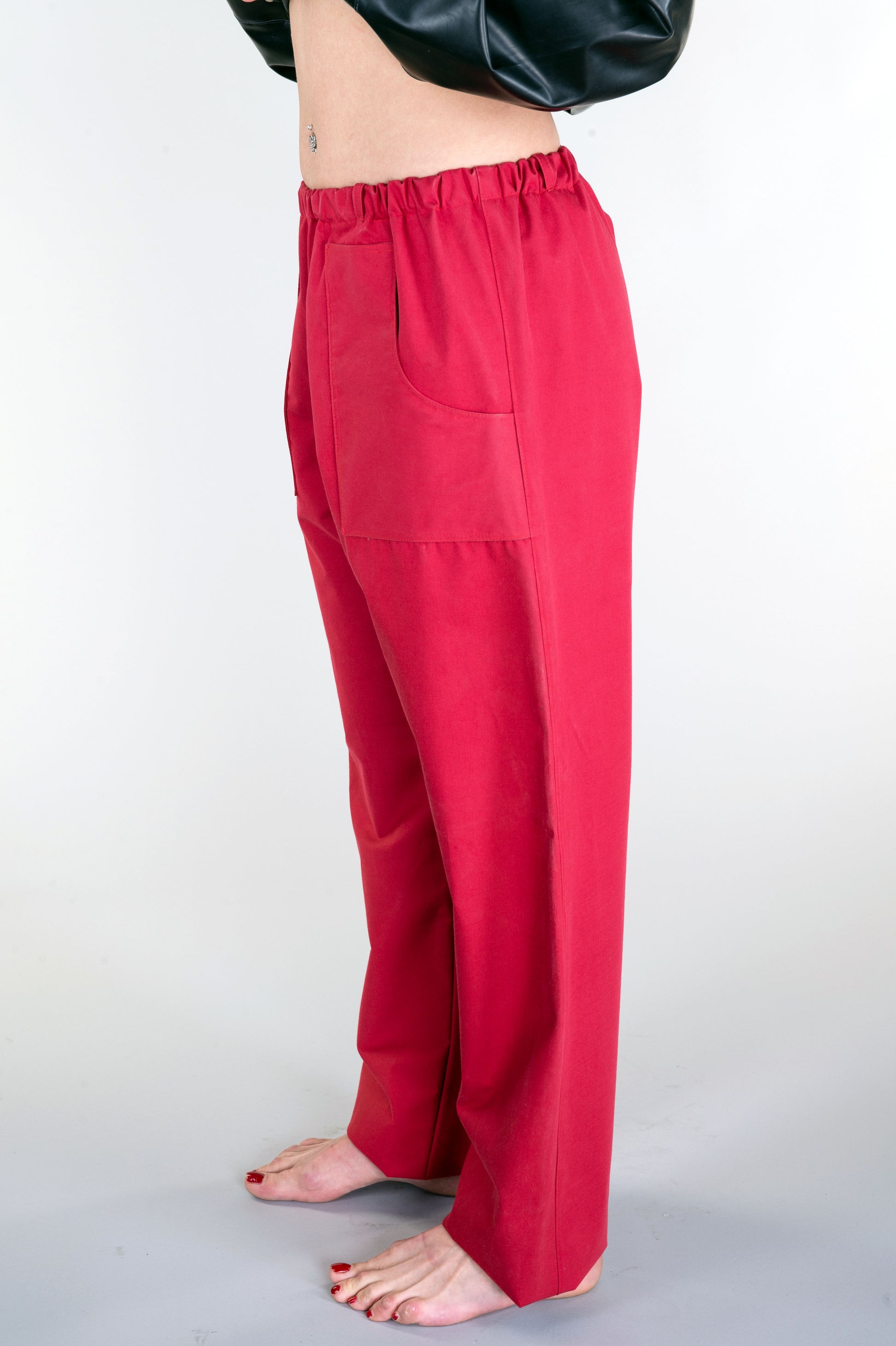 FULL LENGTH TROUSERS WITH STRAIGHT LEGS. CASUAL FIT. ELASTICATED WAIST WITH TIE BELT AND FRONT POCKETS. LATEX 0.40mm - 0.70mm. ALL SEAMS SEWN.